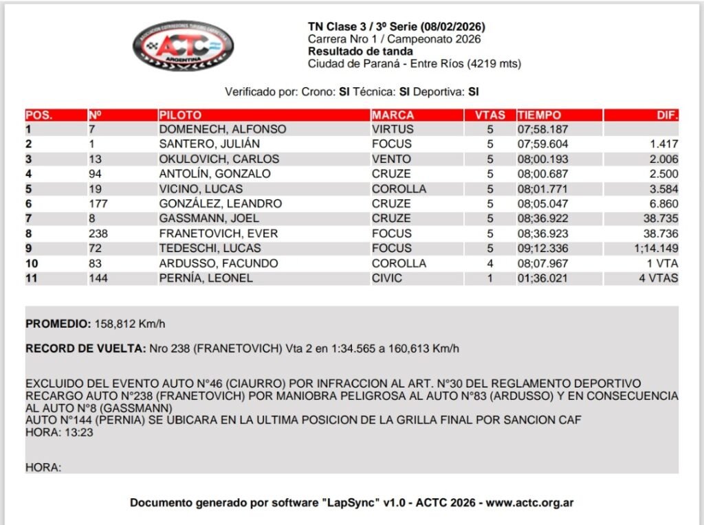 Leandro González, Joel Gassmann, Ever Franetovich y Lucas Tedeschi, completaron la zona de puntos de esta competencia, antes de la prueba final que se disputará a las 14:00 horas en el trazado del Club De Volantes Entrerrianos. Posterior a la serie, fue excluido del evento Miguel Ciaurro, quien regresaba a clase tres a bordo de un Volkswagen Virtus, por infracción al Artículo Nro. 30 del Reglamento de Campeonato.