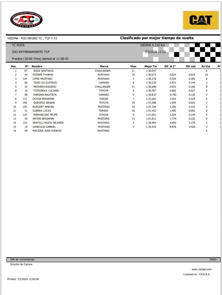 Santiago Biagi hizo el uno en la última tanda de entrenamiento, al marcar un 1m,30s.047/1000 con el Dodge del RUS MED Team y se alista para la clasificación. A solo 24 milésimas quedó Thomas Pozner, con el Ford Mustang del Moriatis Competición, y más alejado, a 329 milésimas completó el podio Faustino Cifre con el Ford Mustang del Fadel Memo Corse.