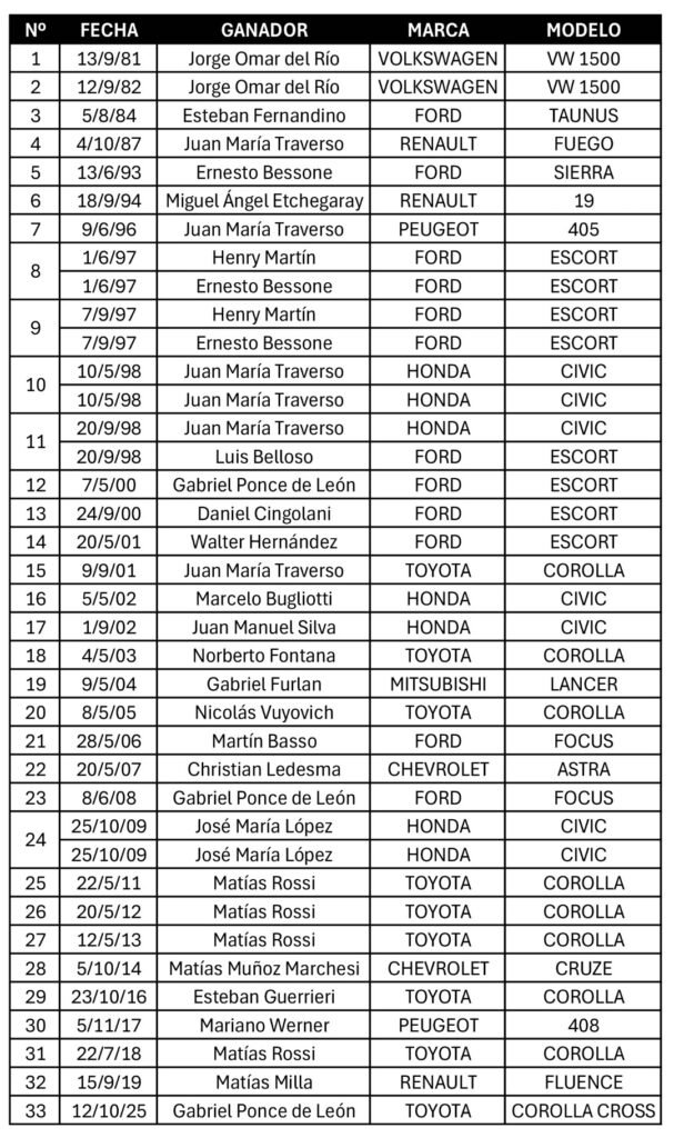 Juan María Traverso es el máximo ganador en “El Zonda” con 6 triunfos y 3 marcas distintas: ganó en 1987 con Renault, en 1996 con Peugeot y en las 3 visitas en 1998 y en 2001 con Honda. Lo siguen Matías Rossi con 4 victorias: el piloto de Del Viso se impuso en 2011, 2012 y 2013 con Toyota, Ernesto “Tito” Bessone y Gabriel Ponce de León con 3: el de Mataderos resultó ser el ganador en 1993 y en 2 carreras que se disputaron en 1997 todas con Ford, mientras que el representante de Junín ganó en 2000 y 2008 con Ford y la última en 2025 con Toyota. Esta fue la primera en “El Zonda” para el nuevo modelo SUV de la marca japonesa con el Corolla Cross.