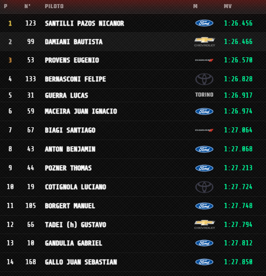 Con el Ford Mustang del Fadel Racing, superó a Bautista Damiani (Chevrolet Camaro), líder del campeonato, por apenas 0s010 en la clasificación de la 3ª fecha, que se está llevando a cabo en Concepción del Uruguay.