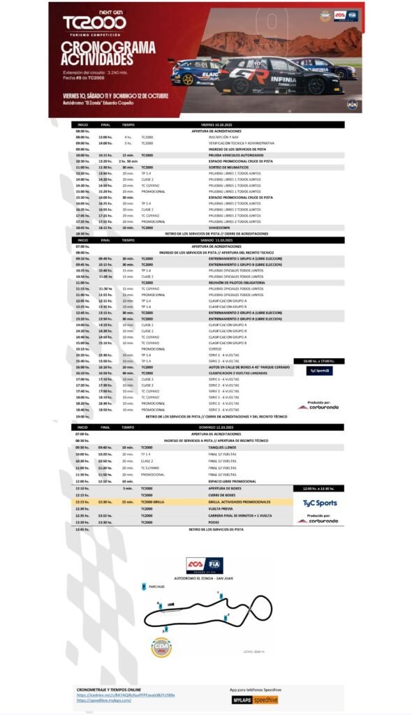 El 46º Campeonato Argentino de TC2000 YPF INFINIA tendrá continuidad con la 9º fecha el próximo 10, 11 y 12 de octubre en el Autódromo “El Zonda” Eduardo Copello, San Juan. El mítico trazado sanjuanino volverá a tener automovilismo nacional con la llegada de los nuevos vehículos SUV de 500 hp de potencia junto al zonal cuyano. A continuación, todos los detalles del cronograma de actividades.