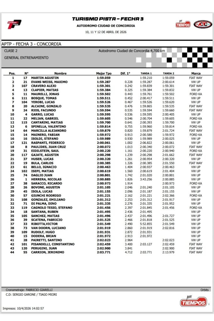 Agustín Martín y el Fiat Uno Way alistado por el Team Pasini comandaron los entrenamientos de la Clase Dos del Turismo Pista en el autódromo de Concordia, epicentro de la tercera fecha de la temporada 2026. Máximo Evans Weiss y Alejo Cravero culminaron segundo y tercero, respectivamente, en la general.