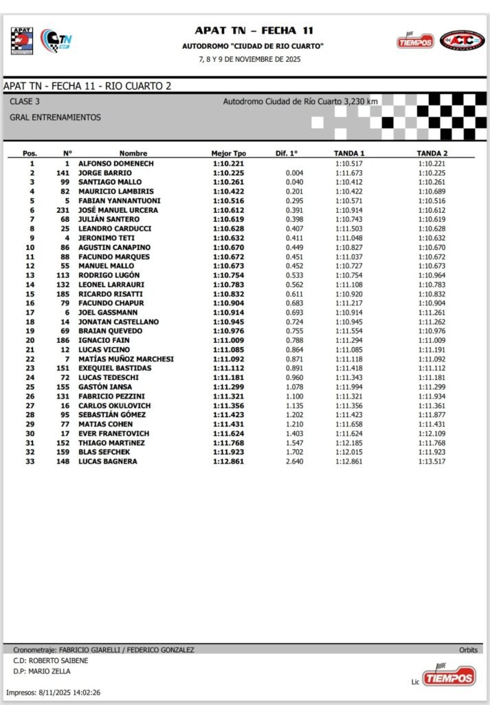 Alfonso Domenech cronometró el mejor tiempo al cabo de la tanda general de entrenamientos de TN Clase 3 disputada en el Autódromo Ciudad de Río Cuarto (Córdoba), a los mandos del Volkswagen Virtus atendido por Saturni Racing, tras cronometrar 1m10s221, en la segunda cronometrada válida por el Gran Premio Gobierno de la Provincia de Córdoba – Copa Vittal.