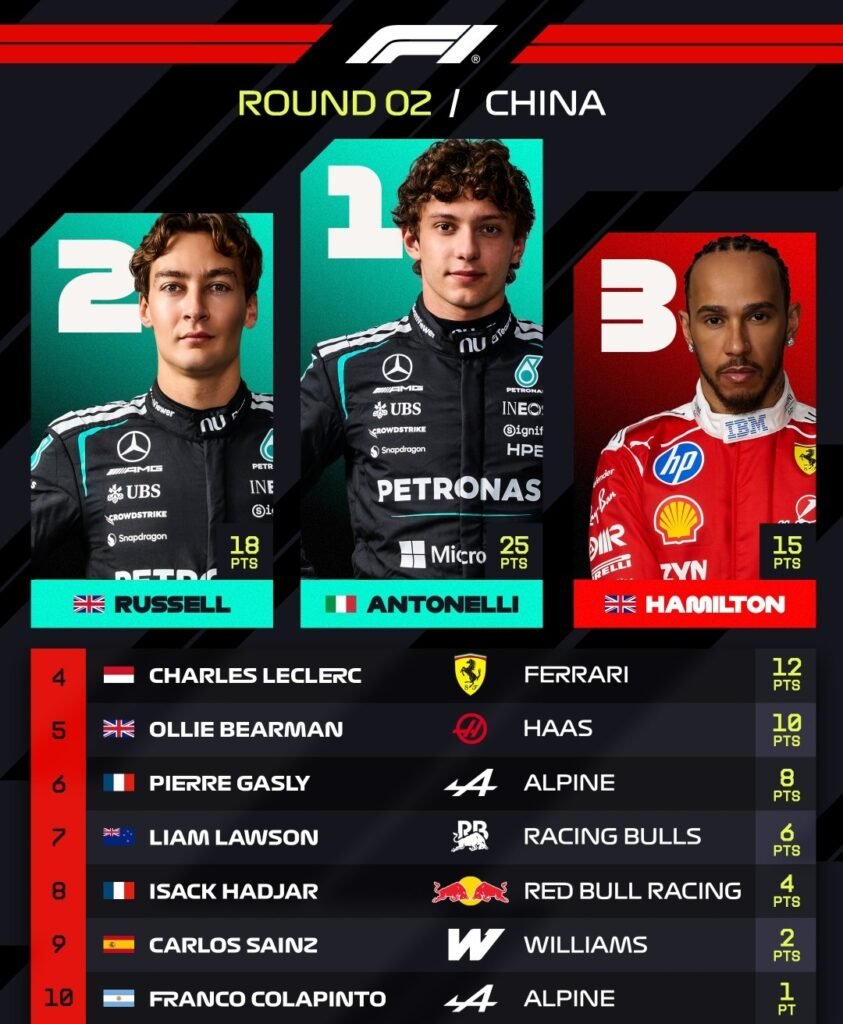 Los Mercedes de nueva cuenta se vieron insuperables con Andrea Kimi Antonelli obteniendo su primera victoria en la Fórmula 1. Franco Colapinto logró el décimo puesto y con ello un punto con Alpine, mientras que Sergio Pérez volvió a cruzar la meta.