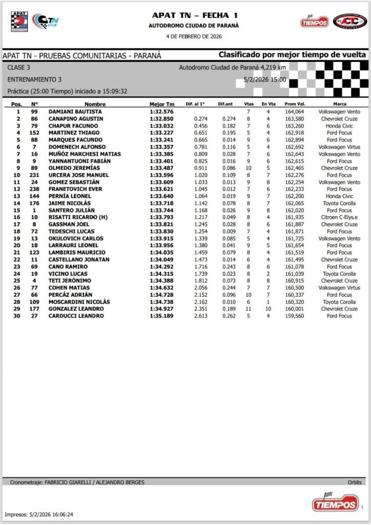 Bautista Damiani obtiene el mejor tiempo en la tanda general de entrenamientos que el TN clase 3 disputó en el Autódromo Ciudad de Paraná, donde el próximo sábado iniciará el Campeonato 2026, en el marco del Gran Premio Club de Volantes Entrerrianos – Copa Pilay.
