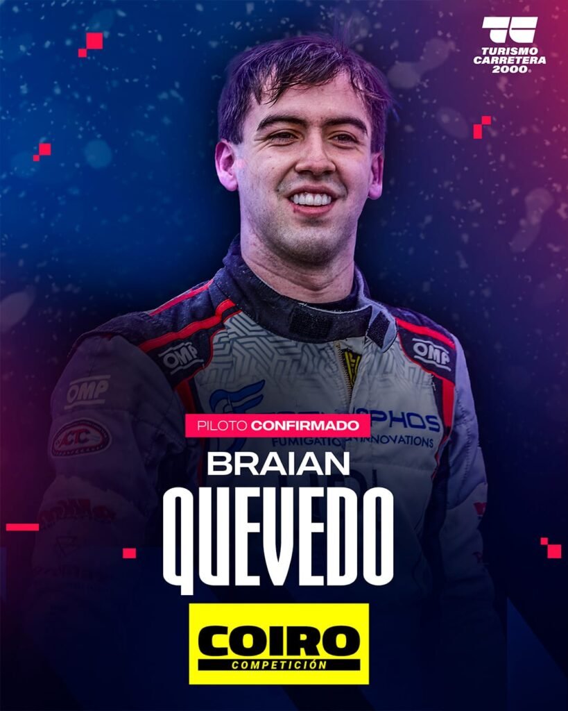 El Coiro Competición, que conduce Marco Jakos, anunció la continuidad del bahiense Braian Quevedo dentro de su estructura en el Turismo Carretera 2000, completando así su plantel de pilotos que ya piensa en en inicio del torneo, que será el 1° de Marzo en el Autódromo Provincia de La Pampa, donde se desarrollará eñ Gran Premio ETANOL ARGENTINO”.