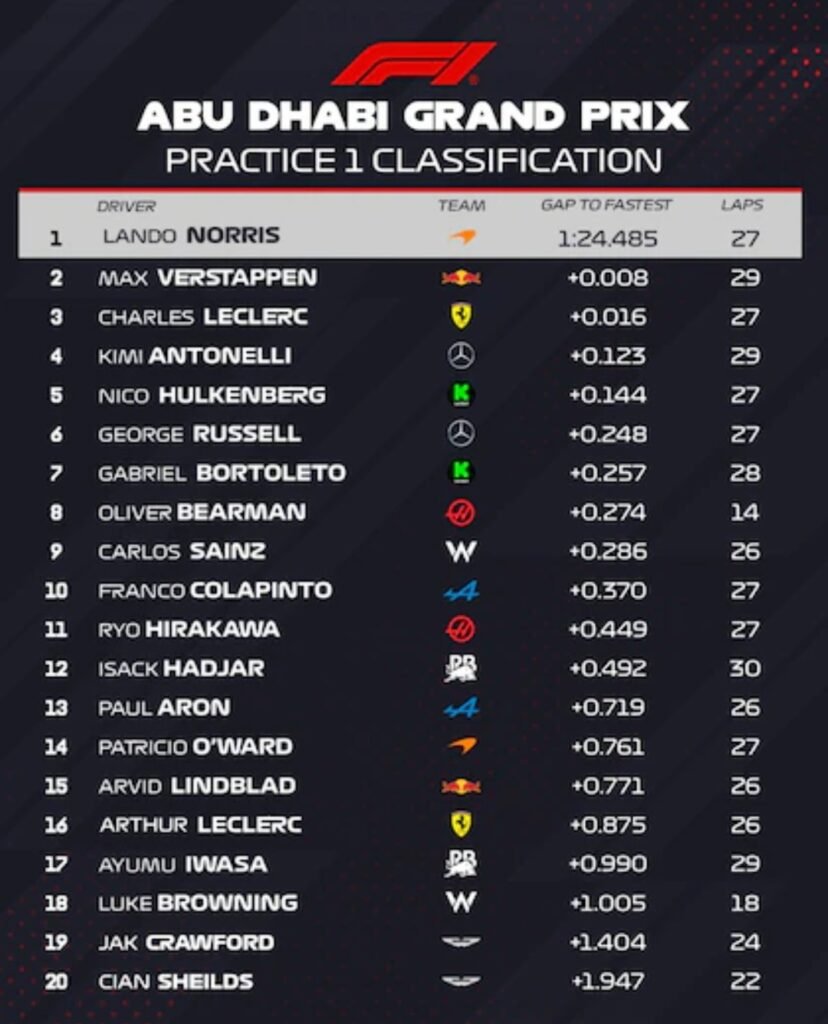 El inicio de la actividad en el Gran Premio de Abu Dhabi tuvo como protagonista a Lando Norris, quien se colocó al frente del clasificador en la primera sesión de entrenamientos libres. El británico registró el mejor tiempo con 1m24s485, en el circuito de Yas Marina, distanciándose por solo ocho milésimas de Max Verstappen, su principal rival en la definición del campeonato de F1 2025.