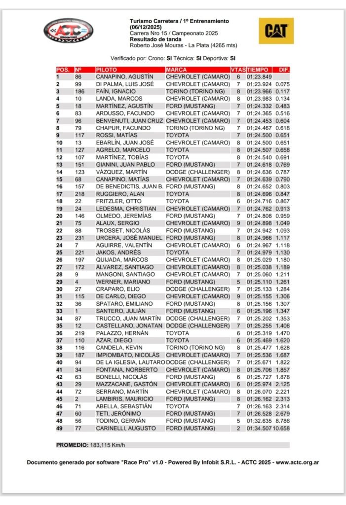 Con el Chevrolet Camaro que le asiste el equipo Canning Motorsport, el piloto Agustín Canapino se quedó con el mejor registro en el primer entrenamiento, que por la última fecha de la Copa de Oro del Turismo Carretera se corre este fin de semana en el autódromo Roberto Mopuras, de la ciudad de La Plata.