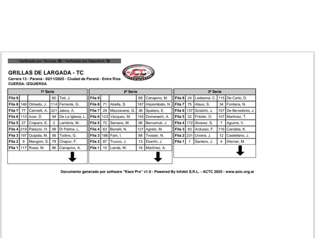 La primera serie, que se largará a las 10.10 hs. del día domingo tendrá a Agustín Canapino junto a Matías Rossi, dos experimentados, un Chevrolet y un Toyota Camry. En la segunda batería, a las 10.35 hs., largarán desee el mejor lugar, Agustín Martinez y Marcos Landa, un Ford y un Chevrolet, el viejo duelo del TC, en tanto que, a las 11.00 hs. se largará la tercera y última serie, con, Mariano Werner y el Campeón, Julián Santero, ambos con Ford Mustang, compartiendo la primera fila.