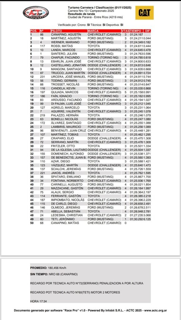 Presagio de una gran carrera. Agustín Canapino, con el Chevrolet Camaro del Canning Motorsport se quedó con la “pole” en la clasificación que el TC completó esta tarde por la 13ª. fecha del campeonato, 3ra. de la Copa de Oro, que se correrá este domingo en el autódromo de la ciudad de Paraná.