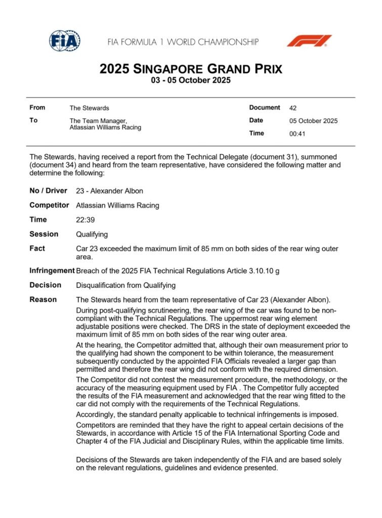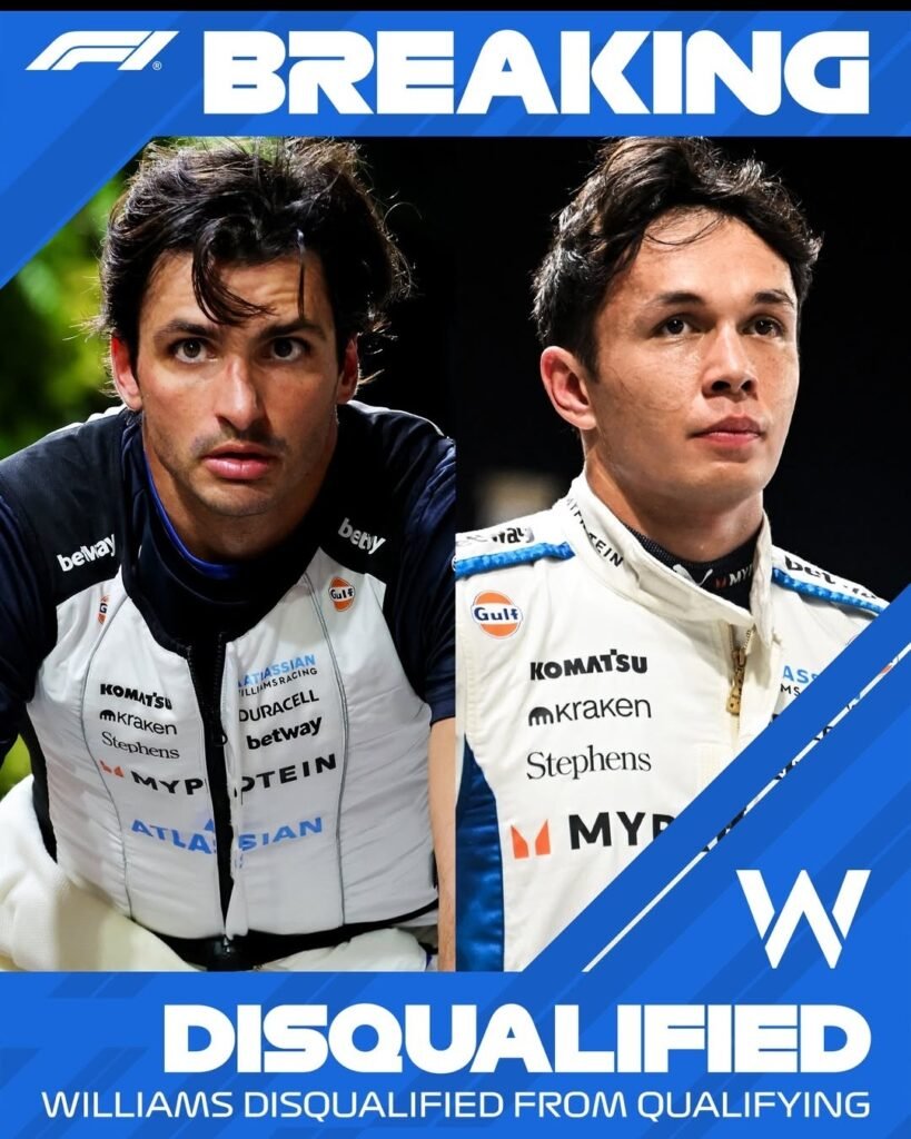 La jornada de clasificación del Gran Premio de Singapur dejó dos resoluciones importantes por parte de los Comisarios de la FIA quienes decidieron descalificar a los Williams de Carlos Sainz y Alexander Albon.