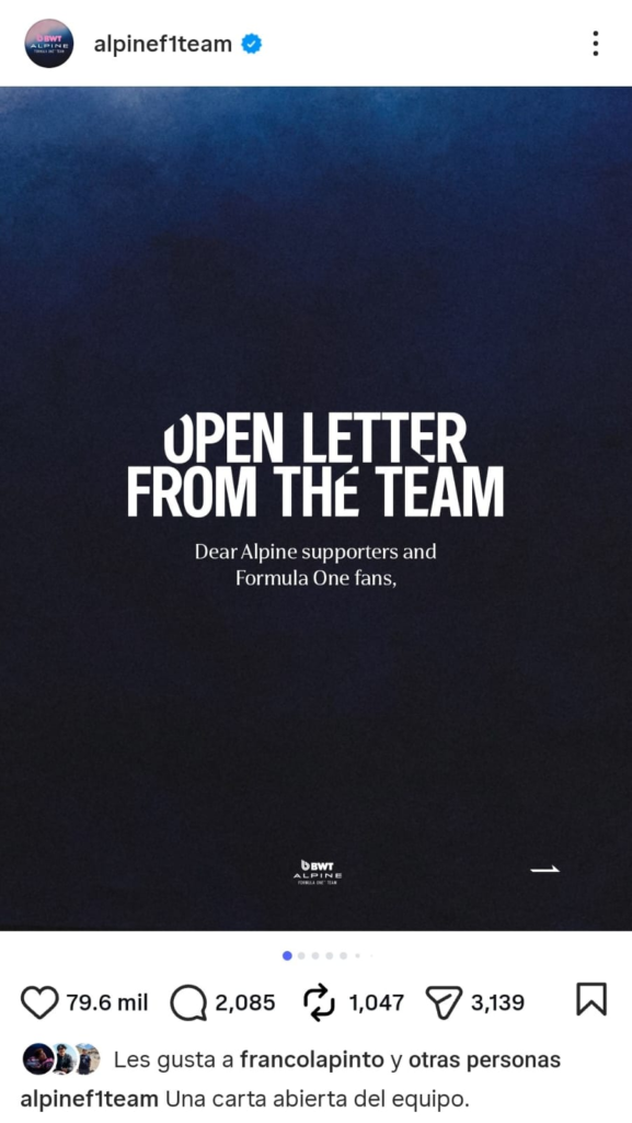 “Estimados seguidores de Alpine y aficionados de la Fórmula 1,