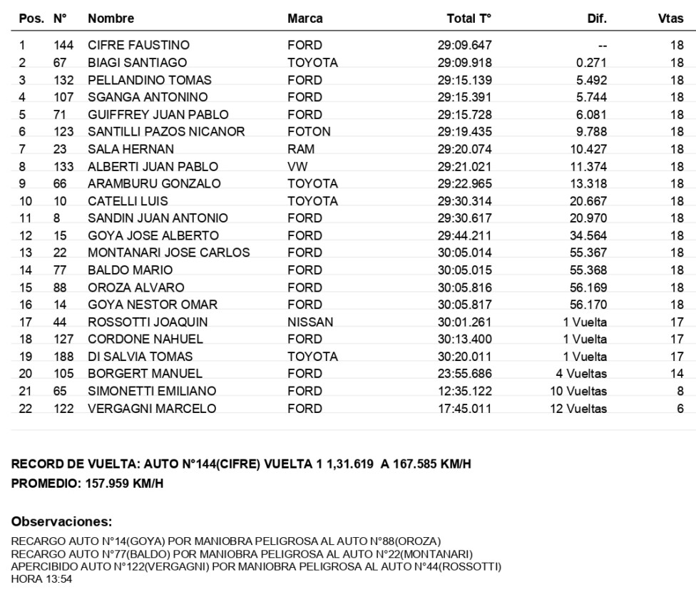 La pelea por la victoria fue un intenso duelo entre Cifre, que largó desde la “pole position”, y Santiago Biagi (Toyota Hilux), que lo hizo desde la 2ª posición. El piloto del RUS Med Team estuvo cerca de dar el zarpazo en una par de ocasiones (la más clara en la 14ª vuelta) pero el piloto del Giavedoni Sport resistió y se llevó el triunfo por una diferencia de apenas 0s271.
