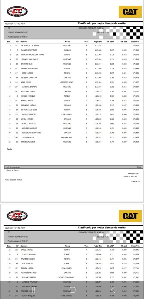Juan Bautista De Benedicits, del RUS MED Team, hizo el mejor tiempo del primer entrenamiento del Turismo Carretera en la fecha 3 de Neuquén y firmó un 1m27s635/1000 a bordo de su Ford Mustang. A solo 53 milésimas quedó Santiago Mangoni, arriba del Chevrolet Camaro del Canning Motorsports, y tercero fue Juan Tomás Catalan Magni con el Toyota Camry del Azar Motorsport, a 125 milésimas.