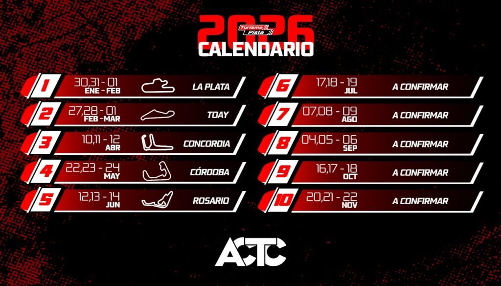 La Asociación Pilotos Turismo Pista confirmó los primeros cinco escenarios de la temporada 2026, que recorrerá distintos puntos del país.