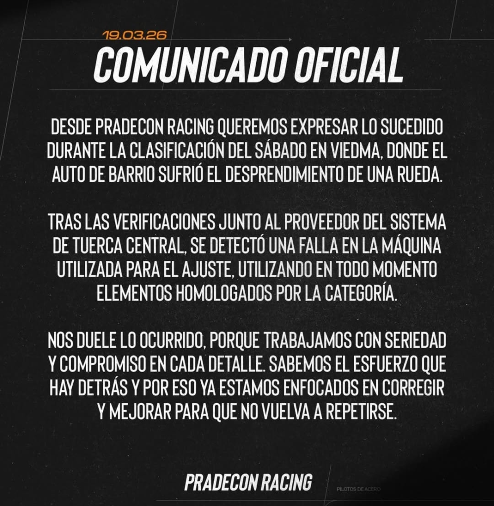 En su descargo, el titular del equipo Pradecon Racing expresó: “Lamentablemente falló una máquina y se salió una rueda, algo que no tiene que pasar pero sucedió… Me están cobrando una multa igual que a un equipo que está fuera de reglamento, que está premeditado, yo no premedité que se salga una rueda”.
