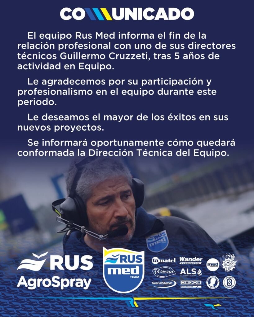 El RUS MED Team anunció a través de un comunicado publicado en sus redes sociales que dejará de trabajar junto a Guillermo Cruzetti, uno de los directores técnicos de la escuadra con sede en Arrecifes.