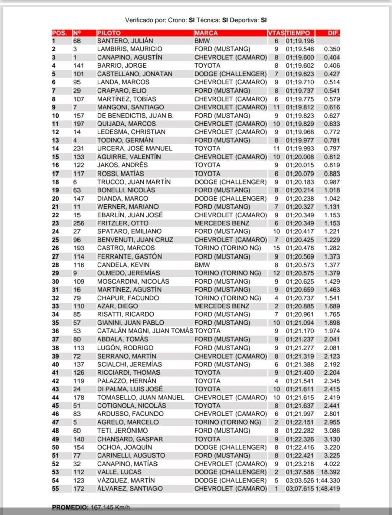 En el segundo entrenamiento de Turismo Carretera, el más veloz fue Julián Santero. El mendocino colocó a BMW en lo más alto de la tabla con un registro de 1,19,196. Detrás de Julián quedaron Marcos Landa (Chevrolet Camaro) y Mauricio Lambiris (Ford Mustang).