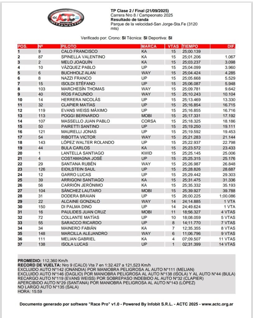 Francisco Calo y el Ford Ka del Juárez Competición prevalecieron en la final de la Clase Dos del Turismo Pista que se desarrolló en el autódromo de San Jorge y correspondió a la octava fecha de la temporada 2025. Valentino Spinella y Joaquín Melo completaron el podio.
