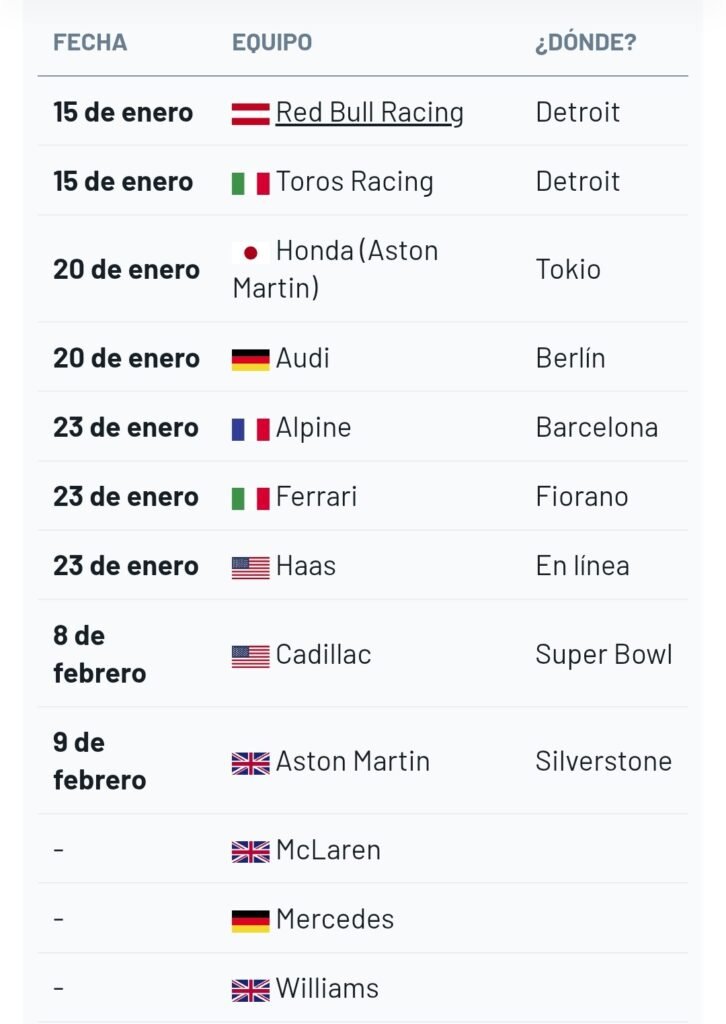 La temporada 2026 de Fórmula 1 ya se acerca a pasos agigantados, y las primeras presentaciones de decoraciones o de monoplazas comenzarán a partir del 15 de enero. McLaren, Mercedes y Williams son las tres únicas escuderías que aún no han confirmado sus planes, pero todos los demás equipos han anunciado cuándo levantarán el velo sobre su temporada.
