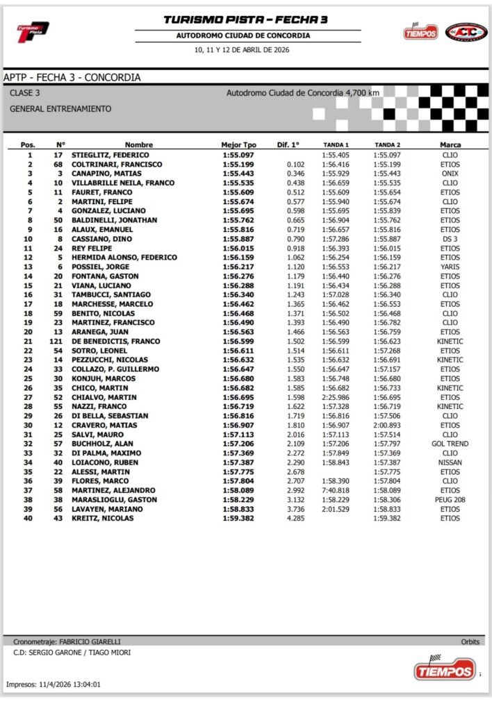 Federico Stieglitz y el Renault Clio del Tigre Racing dominaron los entrenamientos de la Clase Tres del Turismo Pista en el autódromo de Concordia, escenario de la tercera fecha de la temporada 2026. Francisco Coltrinari y Matías Canapino fueron los escoltas.