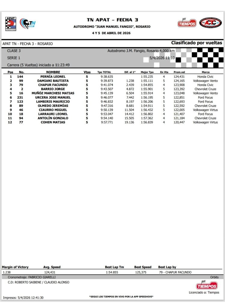 Tras la lluvia de la noche, la humedad en pista y gotas que vuelven a caer sobre Rosario, se disputaron las series clasificatorias de la Clase 3 que fueron ganadas por Liones Pernía, Agustín Canapino y Julián Santero. Los tres más rápidos del sábado. Agustín Canapino (Chevrolet Cruze) y Leonel Pernía (Honda Civic) conformarán la 1ª fila, mientras que Julián Santero (VW Virtus) y Bautista Damiani (VW Vento) partirán desde la 2ª.
