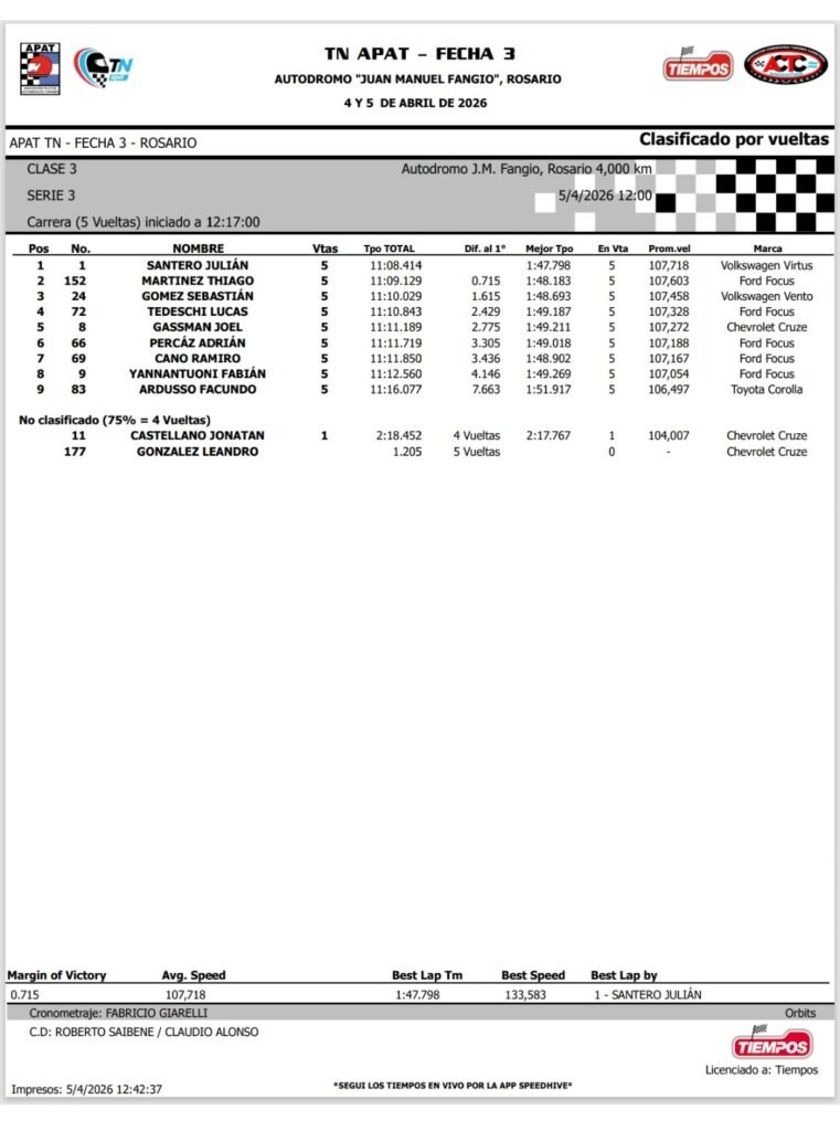 La condición de la pista se presentaba como la ideal para que fuera la batería más veloz del TN Clase 3 pero esa posibilidad rápidamente se esfumó a raíz de un accidente en los primeros metros. De esta manera, Julián Santero (VW Virtus), el ganador de la 3ª y última serie en el autódromo de Rosario, no formará parte de la 1ª fila de la Final de la 3ª fecha del Campeonato 2026, que estará integrada por Agustín Canapino (Chevrolet Cruze) y Leonel Pernía (Honda Civic).