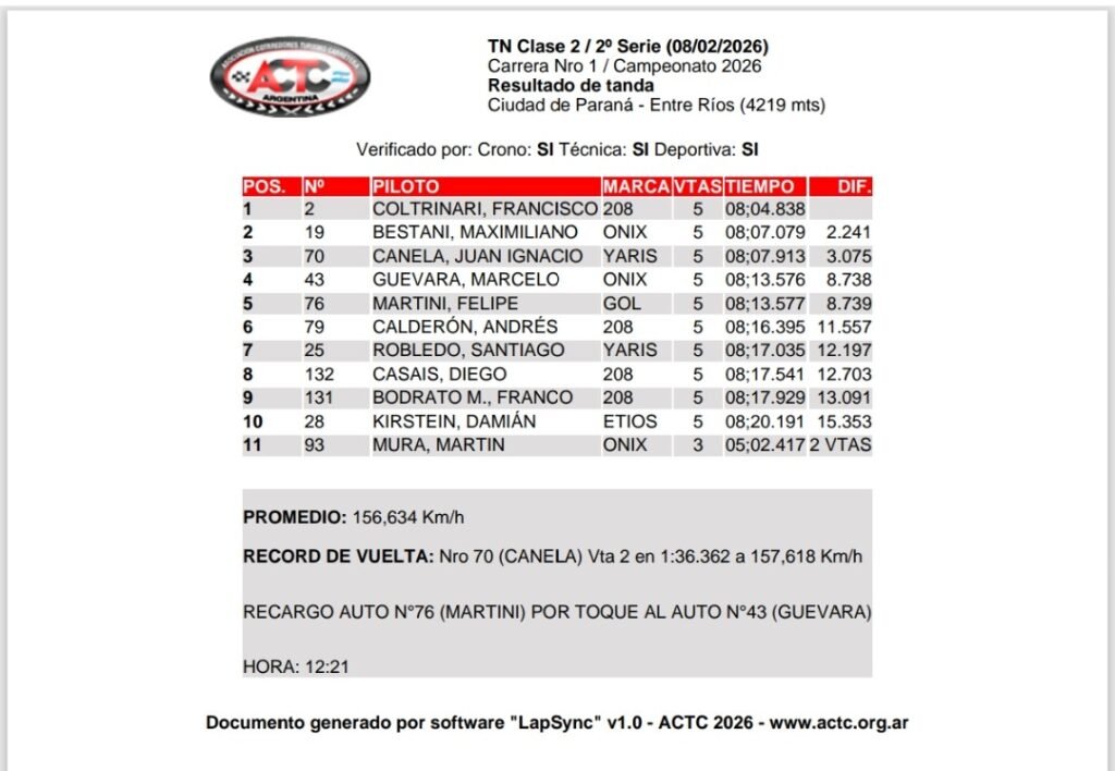 Francisco Coltrinari se impuso en la segunda serie que TN Clase 2 diputó en el Autódromo Ciudad de Paraná (Entre Ríos), a bordo del Peugeot 208 atendido por Saturni Racing, dominando de manera clara el desarrollo del parcial a lo largo de las cinco vueltas diputadas.