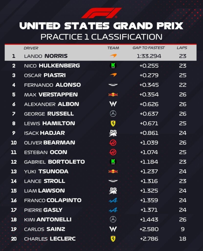 Lando Norris se quedó con el mejor tiempo del único ensayo que habrá en los Estados Unidos. El hombre de McLaren corrió de atrás durante los 60 minutos del entrenamiento, pero los neumáticos blandos fueron la llave del equipo para que el británico cierre con un registro de 1:33.294, mientras que su compañero, Oscar Piastri, terminó tercero a más de dos décimas (1:33.573). La gran sorpresa fue Nico Hülkenberg porque con su Sauber se metió segundo (1:33.549).
