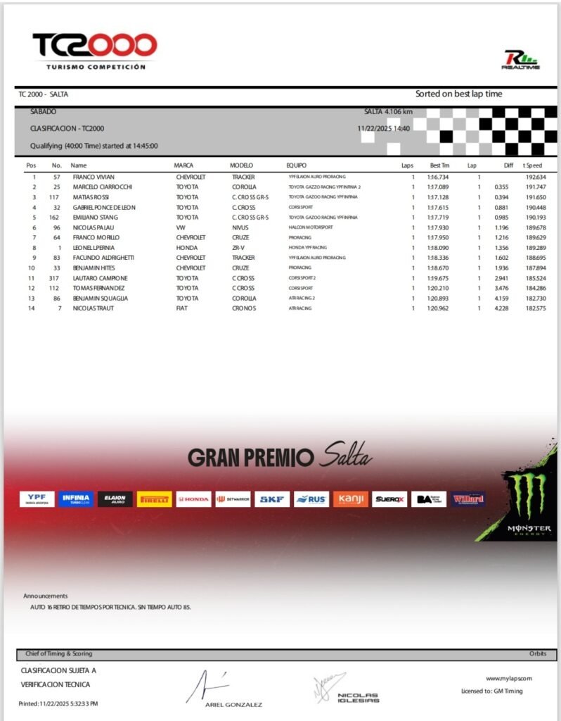 Con un buen marco de público, el TC2000 desarrolló la clasificación del “Gran Premio Salta” correspondiente a la 11º fecha del 46º Campeonato Argentino YPF INFINIA 2025 en el Autódromo “Martín Miguel de Güemes” de la Provincia de Salta, donde el dominio absoluto fue de Franco Vivian con la Chevrolet Tracker #57 del YPF ELAION AURO Proracing. El piloto de Capital Federal voló en la única vuelta lanzada para romper los relojes y quedarse así con el récord del circuito salteño con un tiempo de 1m16s734/1000 a una velocidad de 192,634 Km/h. De esta manera, Vivian con esta 3º pole en el año y la Nº6 en la categoría mantiene sus chances matemáticas en la lucha por el título argentino.