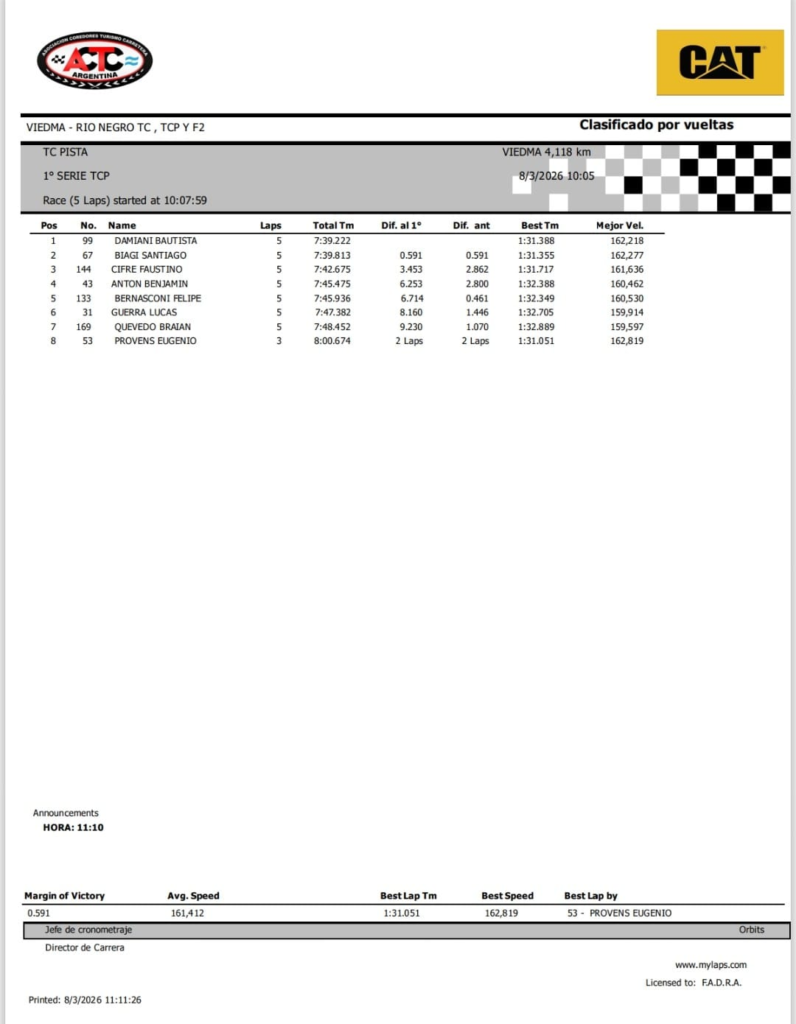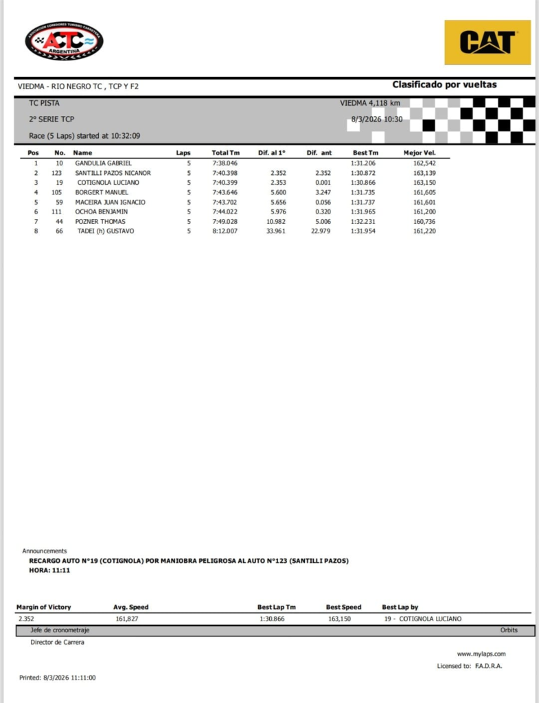 Terminaron las series del TC Pista en el Autódromo Ciudad de Viedma, Bautista Damiani ganó la primera con el Chevrolet Camaro del Canning Motorsports y Gabriel Gandulia, con el Ford Mustang del Moriatis Competición, la segunda, que fue la más rápida y le permite salir desde la punta. La final del Gran Premio Corven en Viedma, por la segunda fecha, se corre a las 12:55, y tendrá en la primera fila al Ford de Gandulia y al Chevrolet de Damiani.