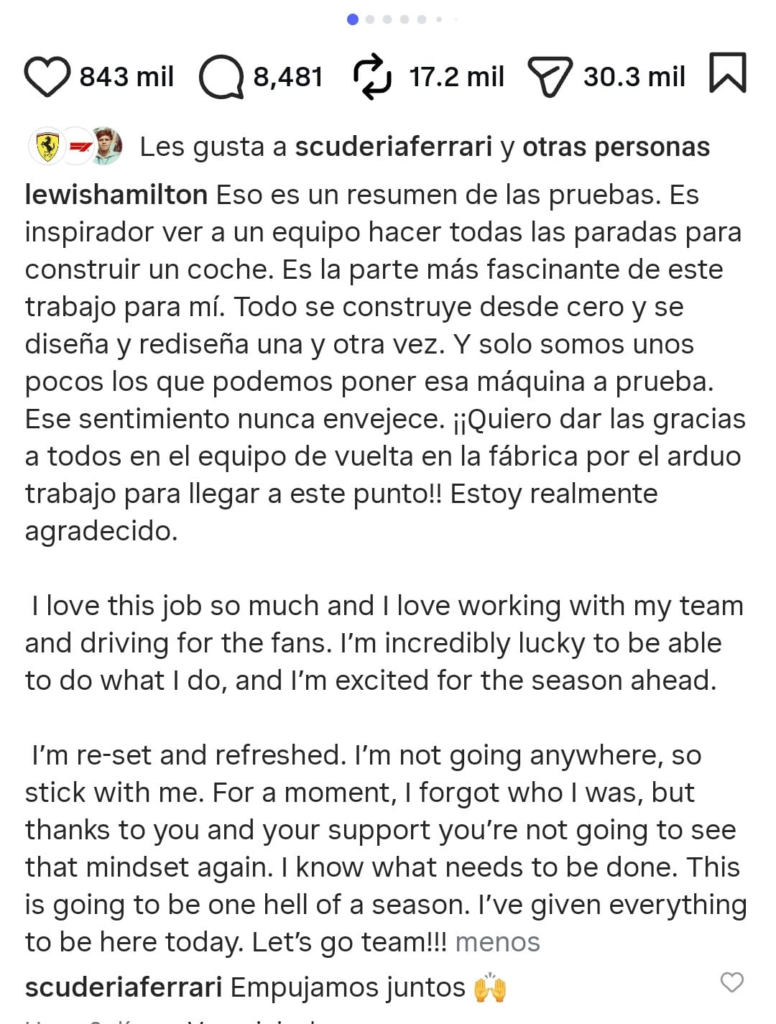 Tras la conclusión de las pruebas de pretemporada el viernes 20 de febrero, Hamilton compartió: “Se acabaron las pruebas. Es inspirador ver a un equipo hacer todo lo posible para construir un coche. Para mí, es la parte más fascinante de este trabajo.