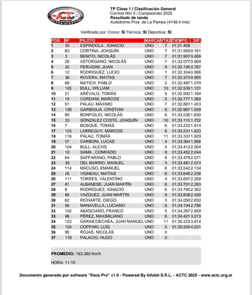Ignacio Espíndola y su Fiat Uno comandaron la clasificación general de la Clase Uno del Turismo Pista en el Gran Premio Fric-Rot, el cual se disputa este fin de semana en el autódromo de La Pampa y corresponde a la novena fecha de la temporada 2025. Joaquín Cortina y Nicolás Benito terminaron como los escoltas.