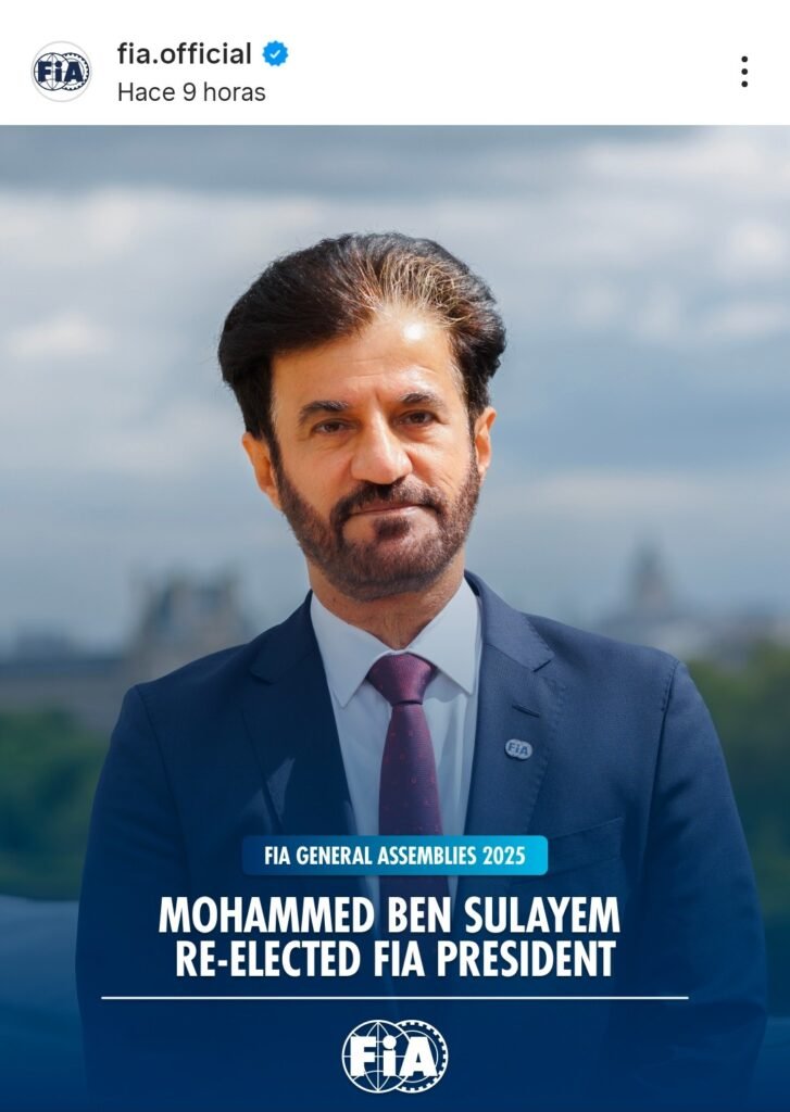 Ben Sulayem se presentó de manera controvertida sin oposición en la elección presidencial de este año, que tuvo lugar en Taskent, Uzbekistán, antes de la ceremonia de entrega de premios 2025. El emiratí cumplirá un segundo mandato de cuatro años, tras haber sido elegido por primera vez en 2021 con el 61,62% de los votos frente al 36,62% de Graham Stoker, entonces vicepresidente deportivo.