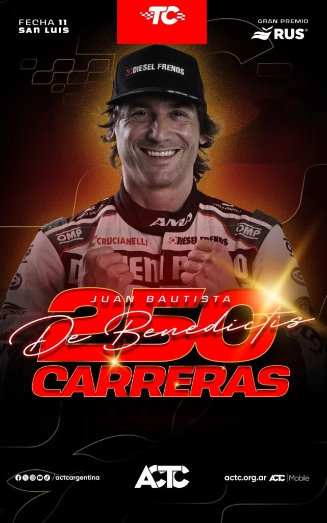 Juan Bautista De Benedictis llegó a las 250 carreras disputadas en la categoría más popular del automovilismo sudamericano, el Turismo Carretera. En el Autódromo Rosendo Hernández de San Luis, logró esa cifra y siempre con la misma bandera, la de Ford.