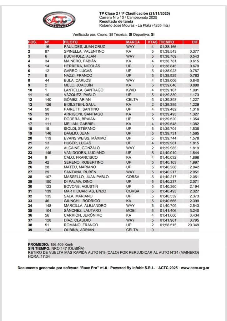 Juan Cruz Paulides y el Fiat Uno Way que atiende su estructura dominaron la primera clasificación de la Clase Dos del Turismo Pista en el Gran Premio Nave Motors, competencia que es válida por la décima y última fecha de la temporada 2025 y se disputa en el autódromo de La Plata. Valentino Spinella y Alan Buchholz fueron segundo y tercero, respectivamente.