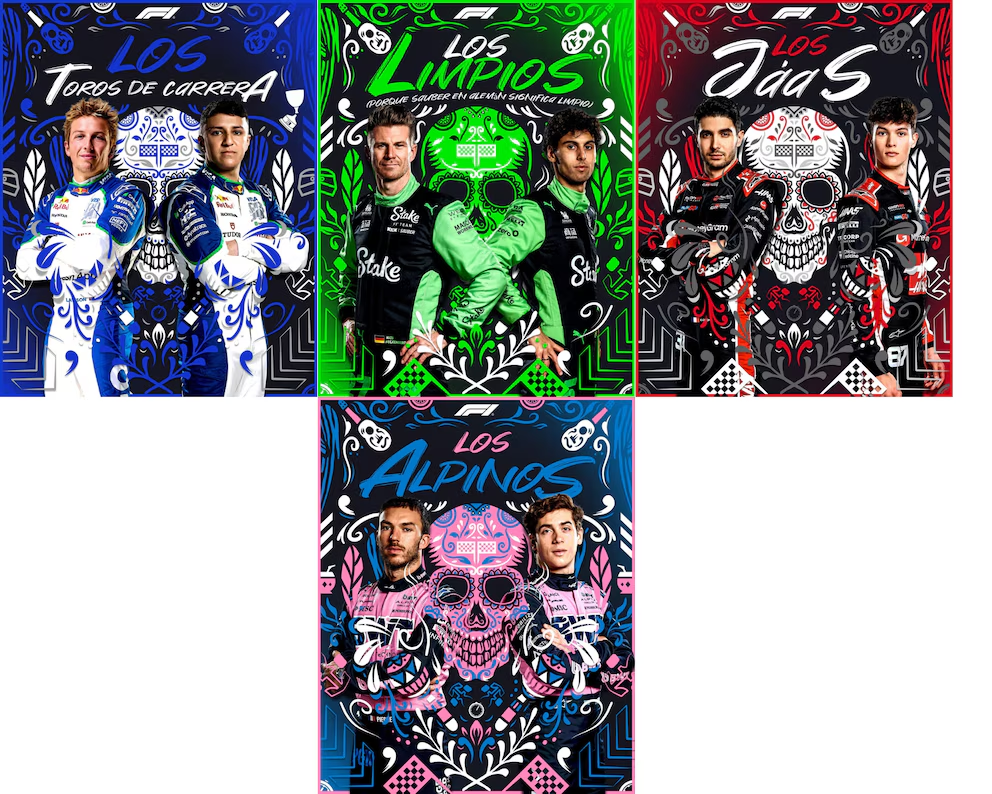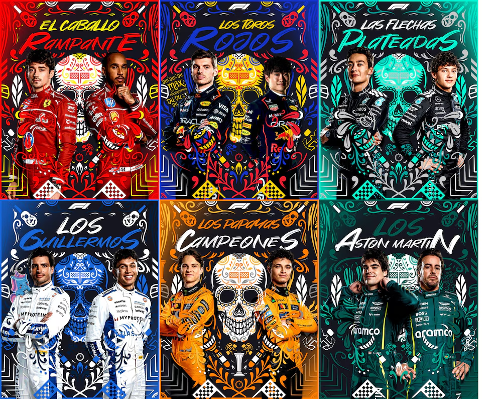 Entre los nombres destacados estuvieron El Caballo Rampante (Ferrari), Los Toros Rojos (Red Bull), Las Flechas Plateadas (Mercedes), Los Papayas Campeones (McLaren), Los Guillermos (Williams), Los Aston Martin, Los Toros de Carrera (Racing Bulls), Los Limbios (Sauber), Los Jáas (Haas) y Los Alpinos (Alpine). Cada uno fue acompañado por visuales estilizados con calaveras, patrones florales y paletas vibrantes, en sintonía con la estética del Día de Muertos.