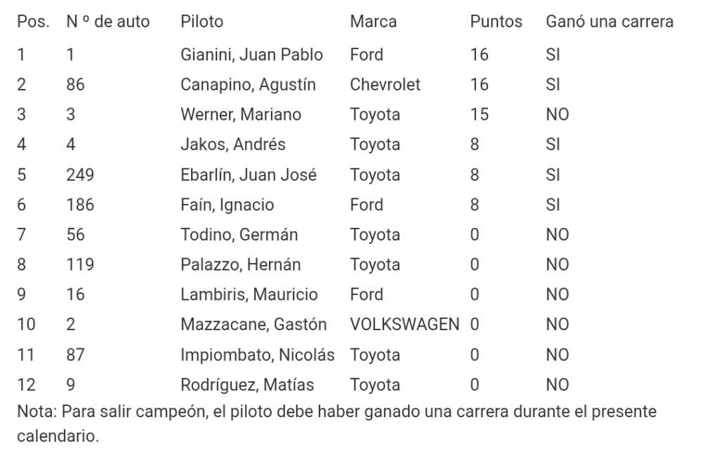 Mariano Werner fue el ganador de la etapa regular y por tal motivo iniciará el mini torneo con 15 puntos. El piloto local todavía no ganó.