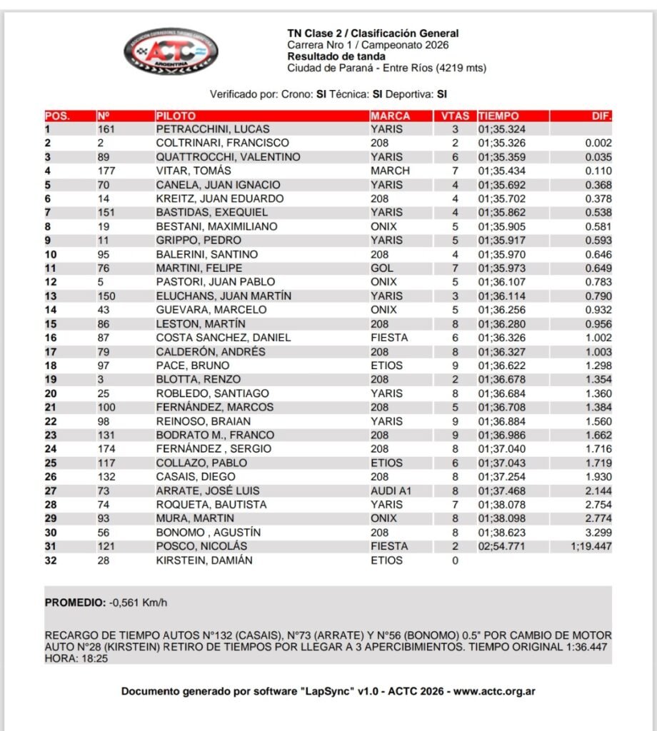 Lucas Petracchini logró la pole position en la primera fecha del Campeonato 2026 de TN Clase 2 que se disputa en el Autódromo Ciudad de Paraná, donde mañana se conocerá al ganador del Gran Premio Club De Volantes Entrerrianos – Copa Pilay.