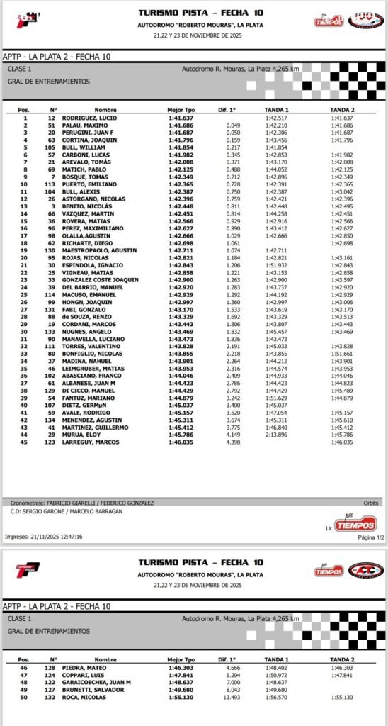 Lucio Rodríguez y el Fiat Uno que alista el Edicar Racing dominaron los entrenamientos de la Clase Uno del Turismo Pista en el Gran Premio Nave Motors, competencia que es válida por la décima y última fecha de la temporada 2025 y se disputa en el autódromo de La Plata. Máximo Palau y Juan Perugini terminaron como escoltas.