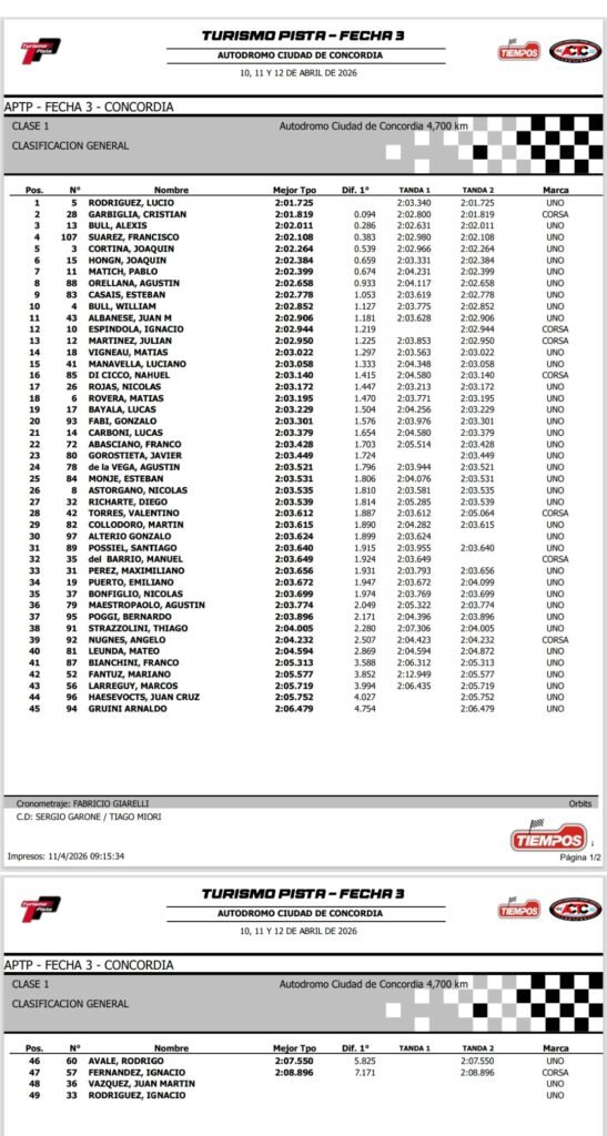 Lucio Rodríguez y el Fiat Uno alistado por el EdiCar Racing se quedaron con la clasificación general de la Clase Uno del Turismo Pista en el autódromo de Concordia, escenario de la tercera fecha de la temporada 2026. Cristian Garbiglia y Alexis Bull concluyeron como los escoltas.