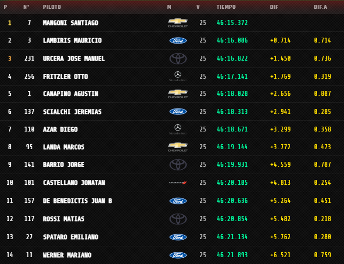 Una nueva relargada para la última vuelta revivió las esperanzas de Lambiris, que quiso aguantar por fuera, pero Mangoni rápidamente neutralizó todo a su antojo. Del primero hasta el séptimo llegaron como largaron en la grilla.