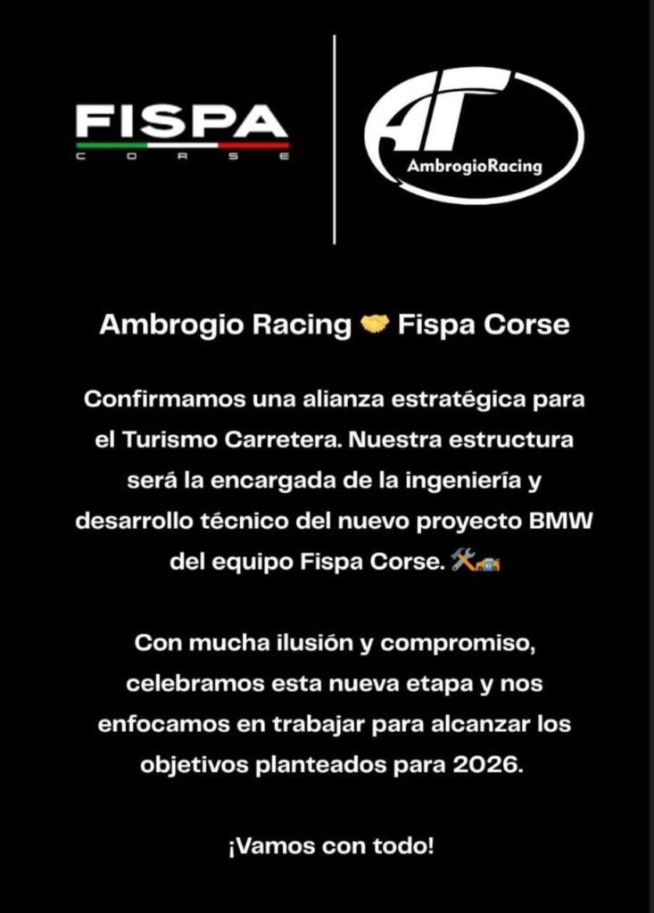 Informamos a nuestros Sponsors, proveedores, allegados y público en general que, a partir de la fecha, el equipo Ambrogio Racing será el encargado de la ingeniería del BMW Motorsport. Con mucha ilusión y compromiso celebramos esta nueva etapa y estamos enfocados en trabajar para alcanzar los objetivos planteados para el 2026.