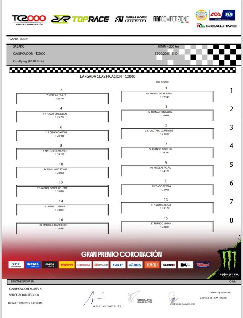 Tiago Pernía (Honda ZR-V #85 – Honda YPF Racing), Emiliano Stang (Toyota Corolla Cross GR-S #162 – Toyota Gazoo Racing YPF INFINIA), Nicolás Palau (VW Nivus #96 – Halcón Motorsport), Mateo Polakovich (Fiat Cronos #16 – ATR Racing) y el juninense Franco Morillo (Chevrolet Cruze #64 – Proracing) cerraron el “top-ten”.