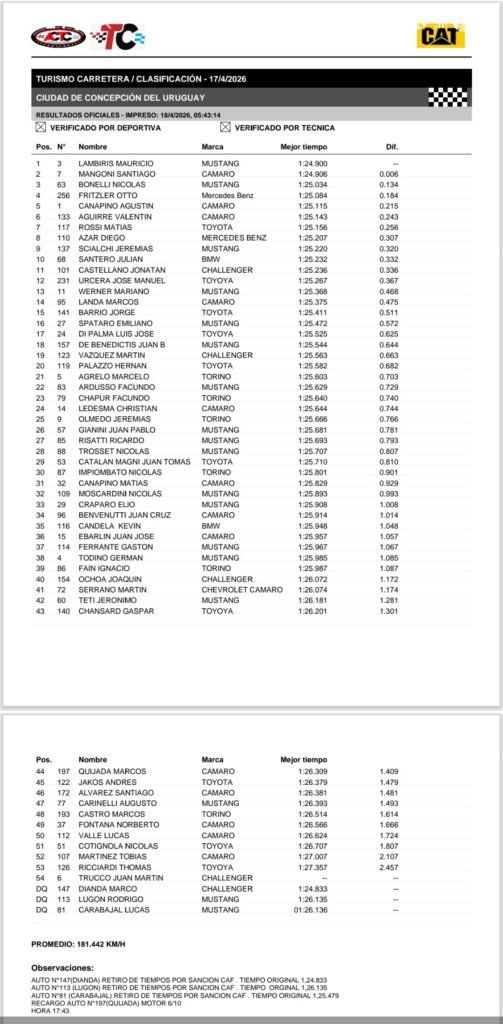La sanción que dictaminó la Comisión Asesora y Fiscalizadora penalizó a Dianda por maniobra peligrosa en la final de Neuquén, por lo que saldrá desde la cola de su serie. Por otra parte, el campeón del TC Pista 2025 desplazó a Otto Fritzler como el más joven en quedarse con la pole en la historia del Turismo Carretera.