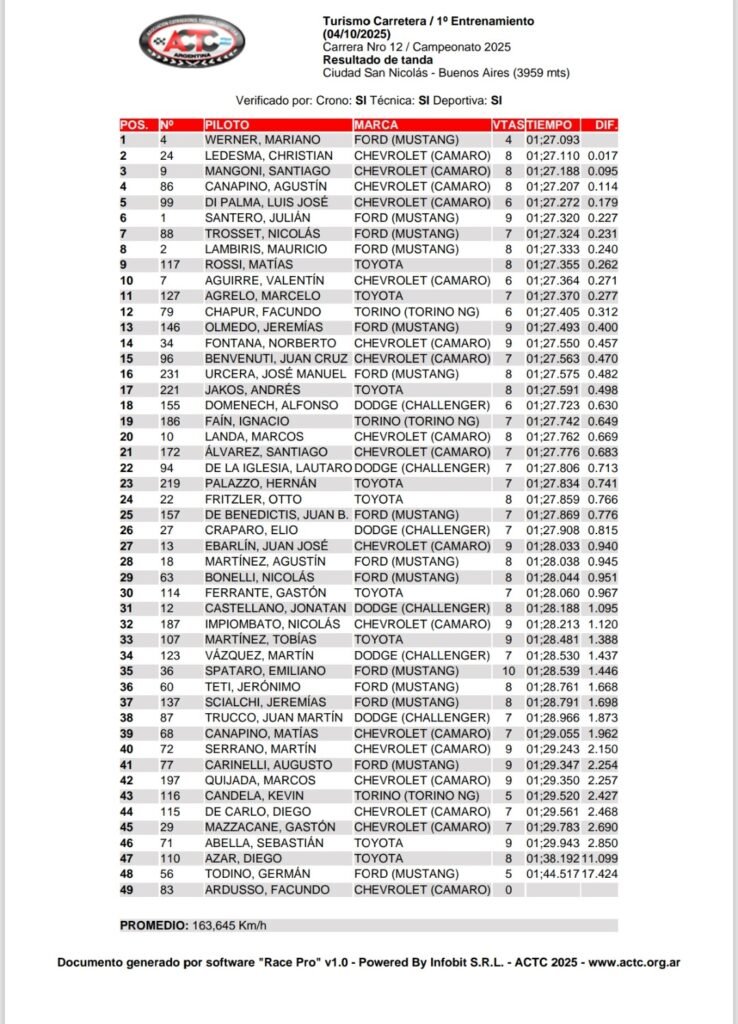 Werner, que viene de ganar en las TC Pick Up en su ciudad, con tan solo cuatro vueltas al trazado nicoleño marcó un tiempo de 1.27.093/1000 para quedarse con el mejor registro de vuelta y sacarle tan solo 17/1000 al piloto Christian Ledesma, que con su Chevrolet Camaro, quedó en el segundo lugar.