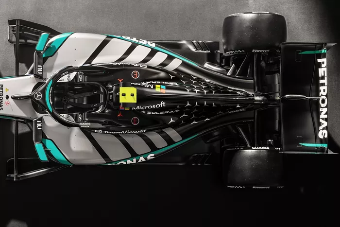 La parte superior del sidepod está ligeramente excavada. Mercedes ha elegido una línea propia destinada a muchos desarrollos. La carrocería no muestra ninguna salida para la expulsión del aire caliente de la unidad de potencia y los aerodinamistas han buscado una gran limpieza del flujo destinado a la parte trasera.