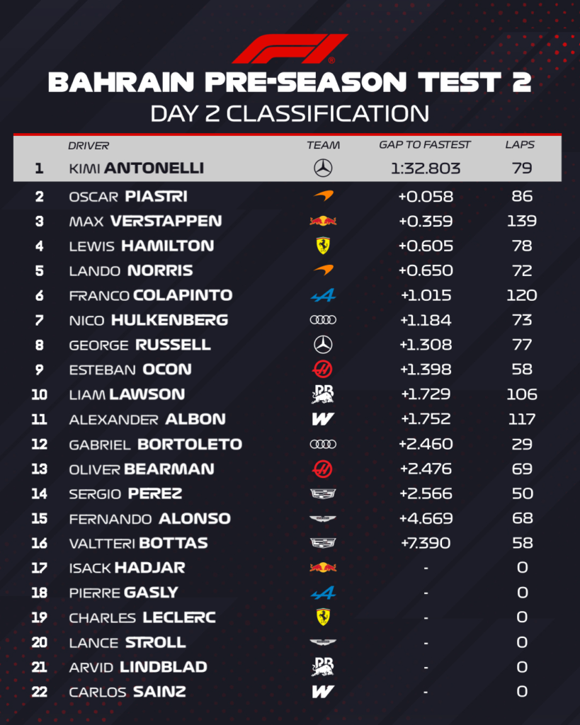 Esta vez, después de que Lando Norris marcara el rumbo en la sesión matutina, Andrea Kimi Antonelli se colocó al frente por la tarde con una vuelta de 1m32s803 que consiguió al entrar en la última hora de actividad. Es el mejor registro en lo que va de la pretemporada en Bahréin.