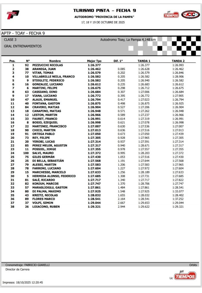 Nicolás Pezzucchi y el Ford Fiesta Kinetic del Benincasa Racing se impusieron en los entrenamientos de la Clase Tres del Turismo Pista en el Gran Premio Fric-Rot, el cual se desarrolla este fin de semana en el autódromo de La Pampa y corresponde a la novena fecha de la temporada 2025. Juan Aranega y Tomás Vitar fueron los escoltas.