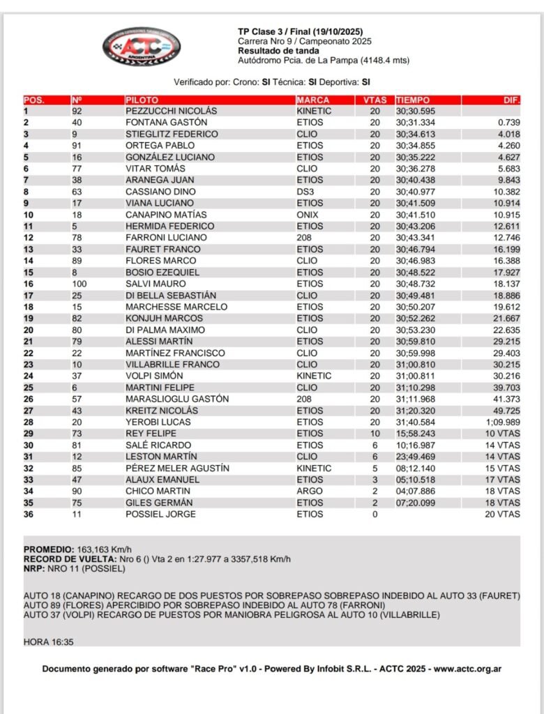 Nicolás Pezzucchi y el Ford Fiesta Kinetic del Benincasa Racing se llevaron la victoria en la carrera de la Clase Tres del Turismo Pista en el Gran Premio Fric-Rot, que se disputó en el autódromo de La Pampa y correspondió a la novena fecha de la temporada 2025. Gastón Fontana y Federico Stieglitz completaron el podio.